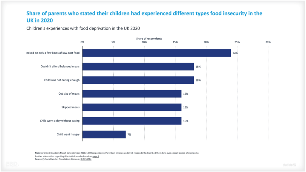 In-work poverty has been rising in recent years, with many low-income families struggling to make ends meet on low wages. Children living in low-income families experience food insecurity with almost 1 in 5 parents reporting that they can’t afford balanced meals.