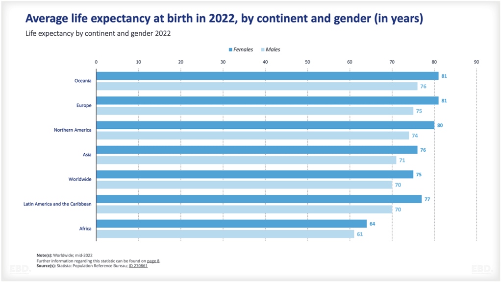 Variation in life expectancy is often analysed by gender and/or geography. Globally, Oceania and Europe have the highest levels of life expectancy with a life expectancy at birth of 81 for females, and 75 and 75 for males respectively. Females in Oceana and Europe live on average 17 years longer than their counterparts in Africa. Males in Oceana and Europe live on average 16 and 15 years longer than their counterparts in Africa.